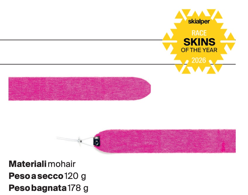 In specific situations, something from Pomoca’s vast range—or a rival brand—might perform better. But overall, this skin comes out on top, excelling in variable conditions and especially on powdery winter snow. With its dense plush, it needs a break-in period to reach peak performance, and glide can be improved with an additional speed treatment. The collection also includes the Race Explore, for less extreme use; the Race Pro Vertical, which has a lighter backing but the same plush; the 55 mm Race Pro Slide, for less steep on-piste races; the Race Pro Grip for steep, icy terrain; and the Race Pro Sprint.
