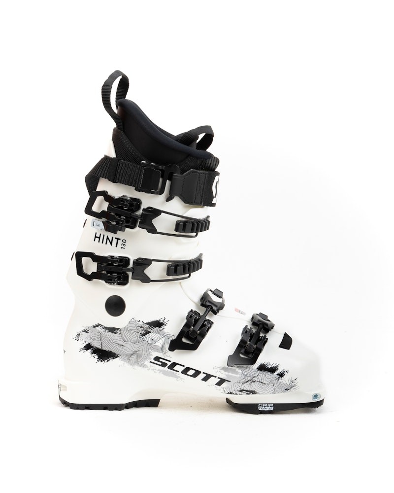 Four shaped alpine-style micro-adjustable Ergal buckles which can be secured to the buckle catches when hiking, plus a quick-attachment durable elastic booster. Small ski/walk lever positioned under the cuff buckle, fiddly to operate with gloves but with a very clean design. A well-finished liner with two loops placed at the top to aid foot insertion. Dual-certification GripWalk sole, lacks midsole protection.